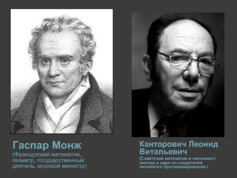 Гаспар Монж(Французский математик, геометр, государственный деятель, морской министр)Канторович Леонид Витальевич(Советский математик и экономист, пионер и один из