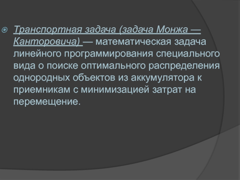 Слайд 3Транспортная задача (задача Монжа — Канторовича) — математическая задача линейного