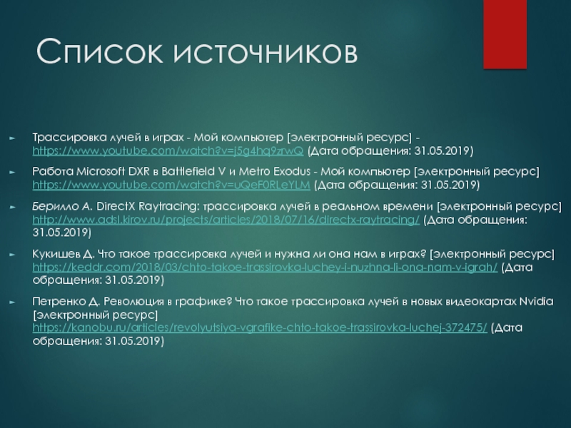 и Metro Exodus - Мой компьютер [электронный ресурс] https://www.youtube.com/watch?v=uQeF0RLeYLM (Дата обращения: 31.05.2019)Берилло А. DirectX Raytracing: трассировка лучей в реальном времени [электронный ресурс] http://www.adsl.kirov.ru/projects/articles/2018/07/16/directx-raytracing/ (Дата обращения: 31.05.2019)