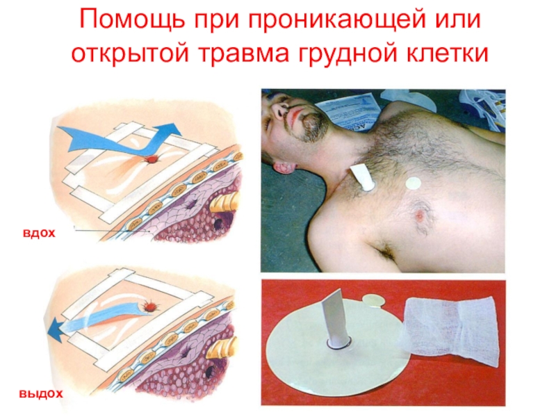 Слайд 10Помощь при проникающей или открытой травма грудной клетки