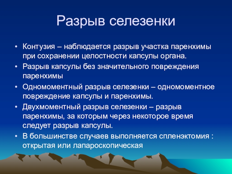 Двухмоментный разрыв селезенки – разрыв паренхимы, за которым через некоторое время следует разрыв капсулы.