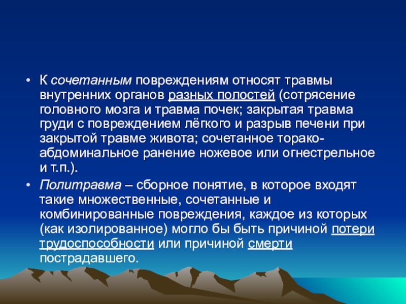Слайд 9К сочетанным повреждениям относят травмы внутренних органов разных полостей (сотрясение