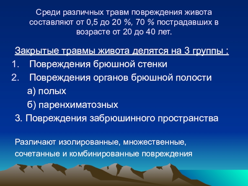 Слайд 16Среди различных травм повреждения живота составляют от 0,5 до 20