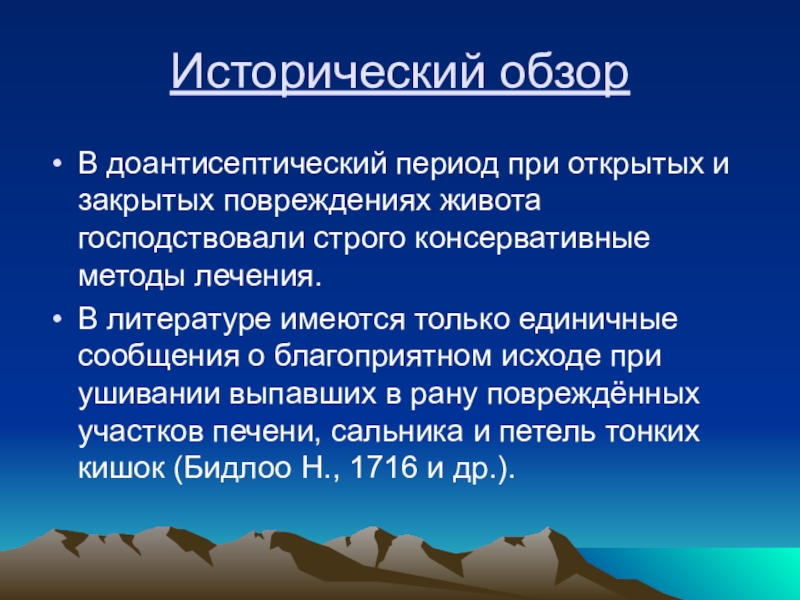 единичные сообщения о благоприятном исходе при ушивании выпавших в рану повреждённых участков печени, сальника и петель тонких кишок (Бидлоо Н., 1716 и др.).