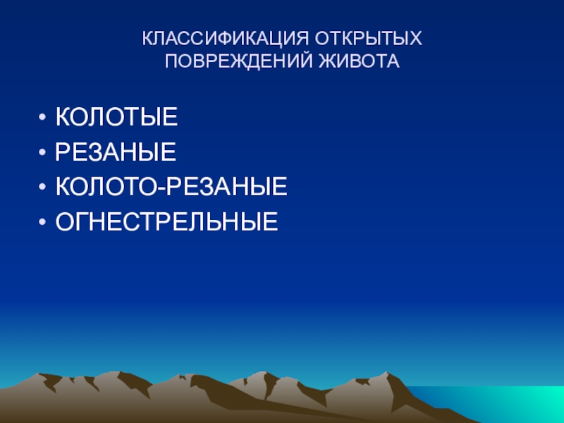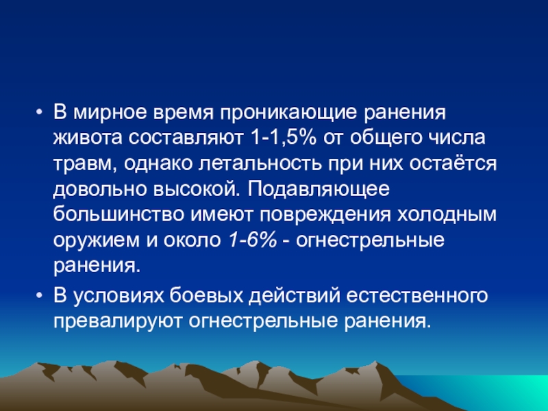 Слайд 14В мирное время проникающие ранения живота составляют 1-1,5% от общего