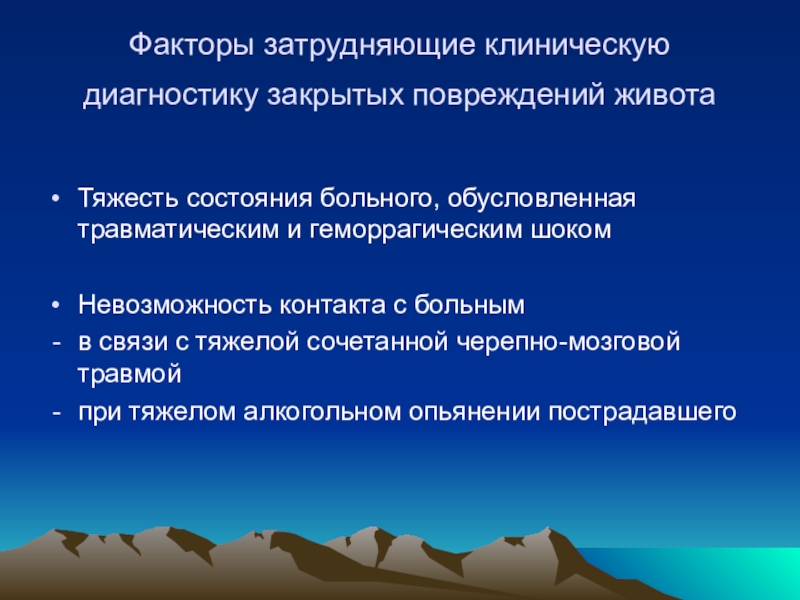 Слайд 49Факторы ,затрудняющие клиническую диагностику закрытых повреждений живота