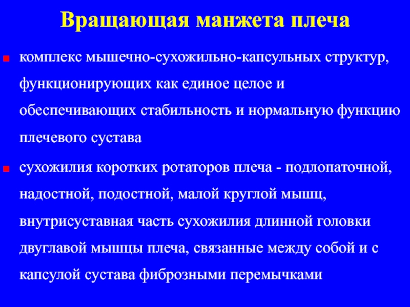 - подлопаточной, надостной, подостной, малой круглой мышц, внутрисуставная часть сухожилия длинной головки двуглавой мышцы плеча, связанные между собой и с капсулой сустава фиброзными перемычками