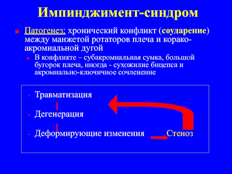 Патогенез: хронический конфликт (соударение) между манжетой ротаторов плеча и корако-акромиальной