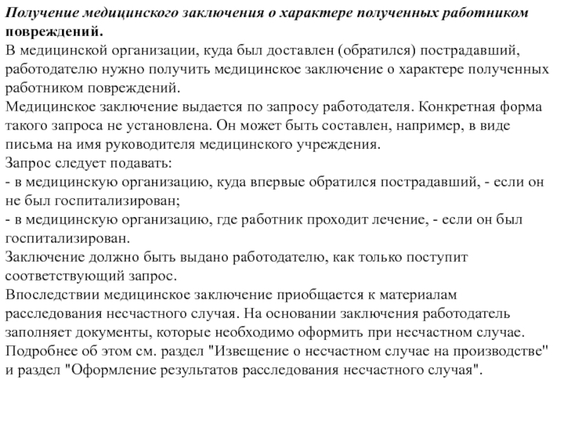 Слайд 8Получение медицинского заключения о характере полученных работником повреждений.