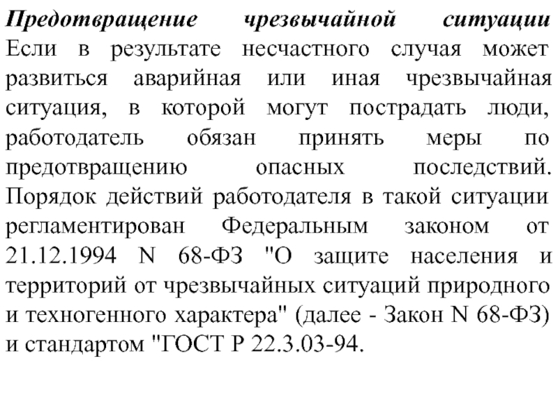 Порядок действий работодателя в такой ситуации регламентирован Федеральным законом от 21.12.1994 N 68-ФЗ "О защите населения и территорий от чрезвычайных ситуаций природного и техногенного характера" (далее - Закон N 68-ФЗ) и стандартом "ГОСТ Р 22.3.03-94.