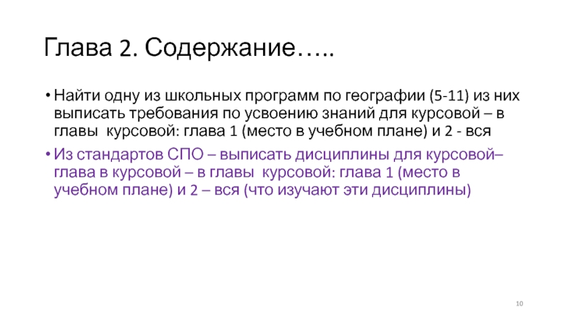Найти одну из школьных программ по географии (5-11) из них выписать требования по усвоению знаний для курсовой – в главы курсовой: глава 1 (место в учебном плане) и 2 - вся