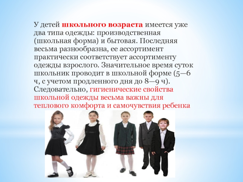 Слайд 14У детей школьного возраста имеется уже два типа одежды: производственная (школьная форма)