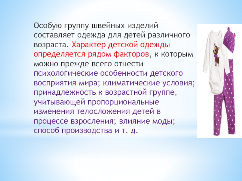 Слайд 2Особую группу швейных изделий составляет одежда для детей различного возраста.