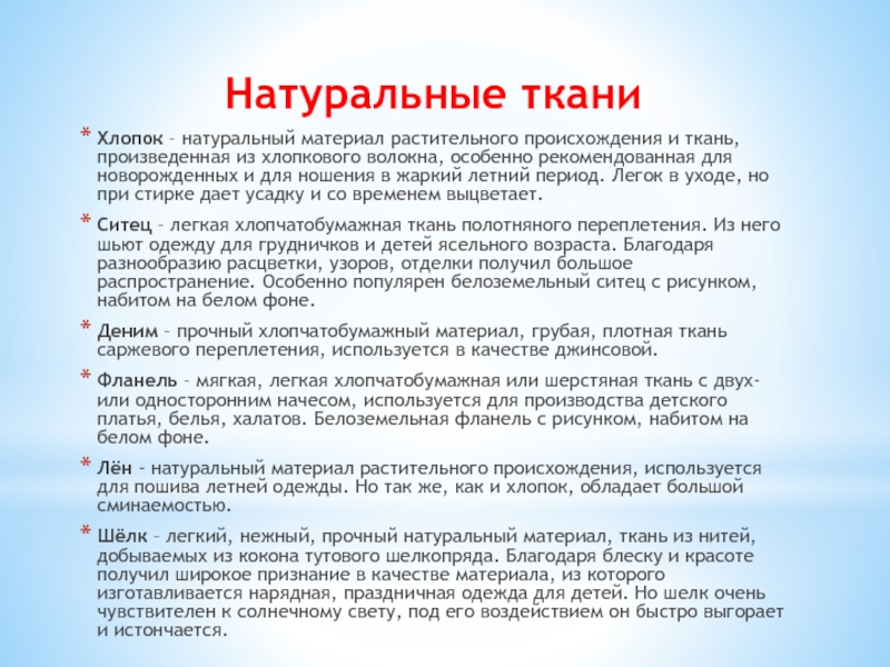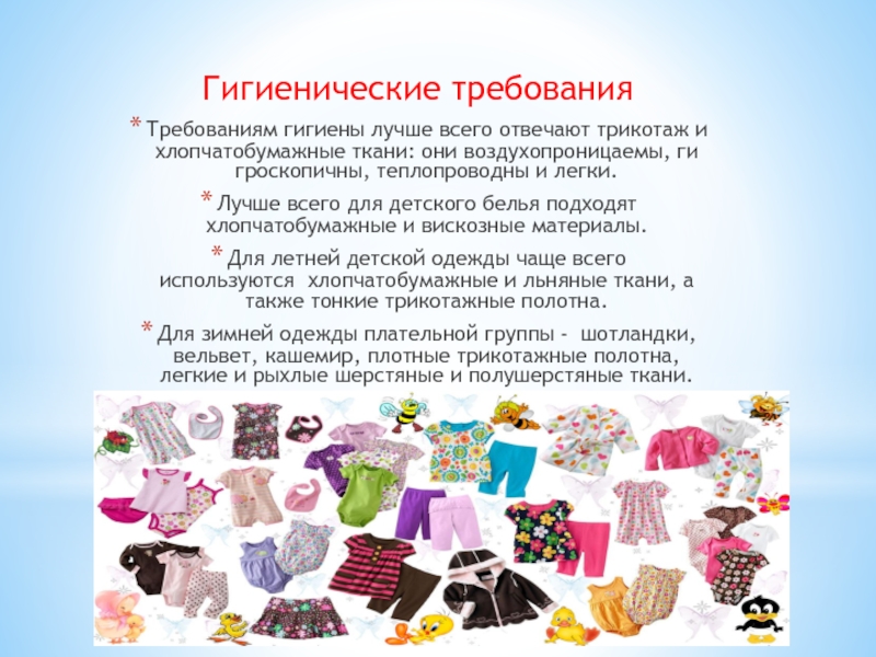 Слайд 13Для детей ясельного возраста наиболее подходят хлопчатобумажные ткани: они гигроскопичны, хорошо