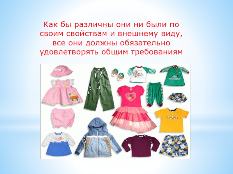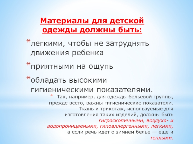 Слайд 7Так, например, для одежды бельевой группы, прежде всего, важны гигиенические