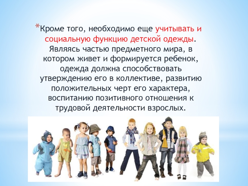 Слайд 3Кроме того, необходимо еще учитывать и социальную функцию детской одежды.