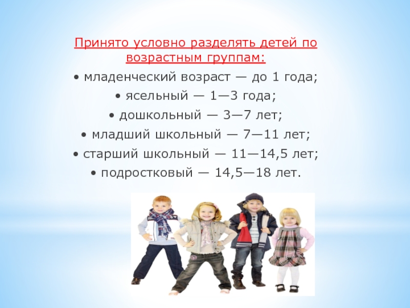 Слайд 4Принято условно разделять детей по возрастным группам: