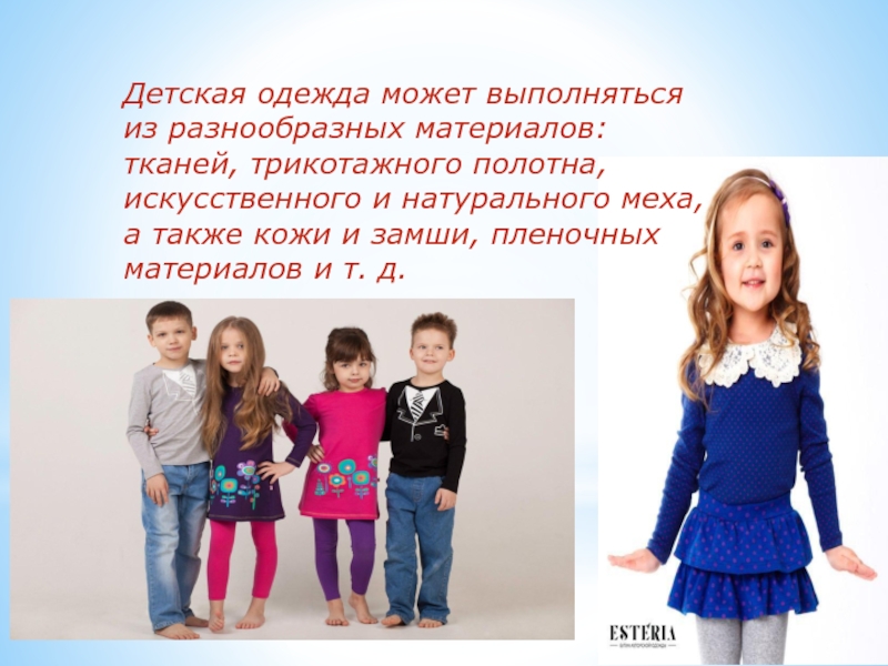 Слайд 5Детская одежда может выполняться из разнообразных материалов: тканей, трикотажного полотна,