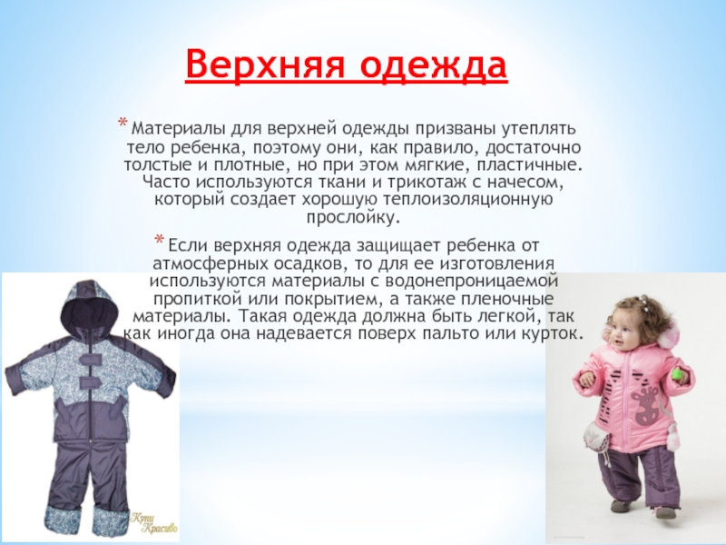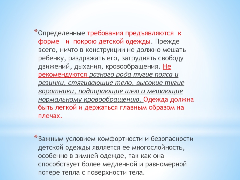 Важным условием комфортности и безопасности детской одежды является ее многослойность, особенно в зимней одежде, так как она способствует более медленной и равномерной потере тепла с поверхности тела.