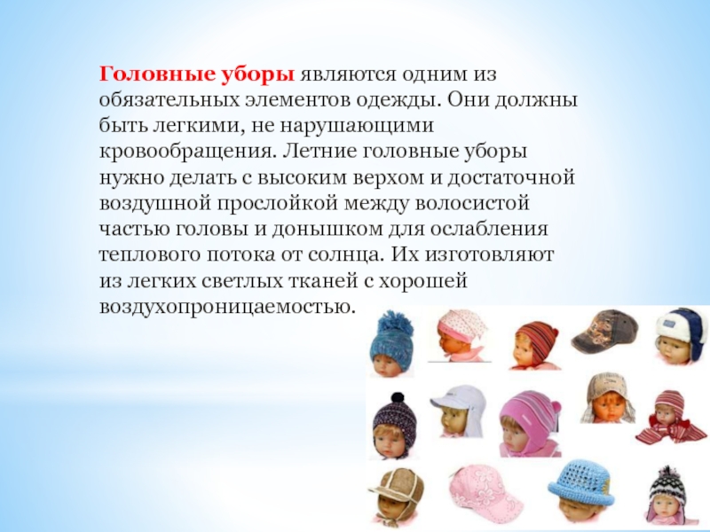 Слайд 15Головные уборы являются одним из обязательных элементов одежды. Они должны быть