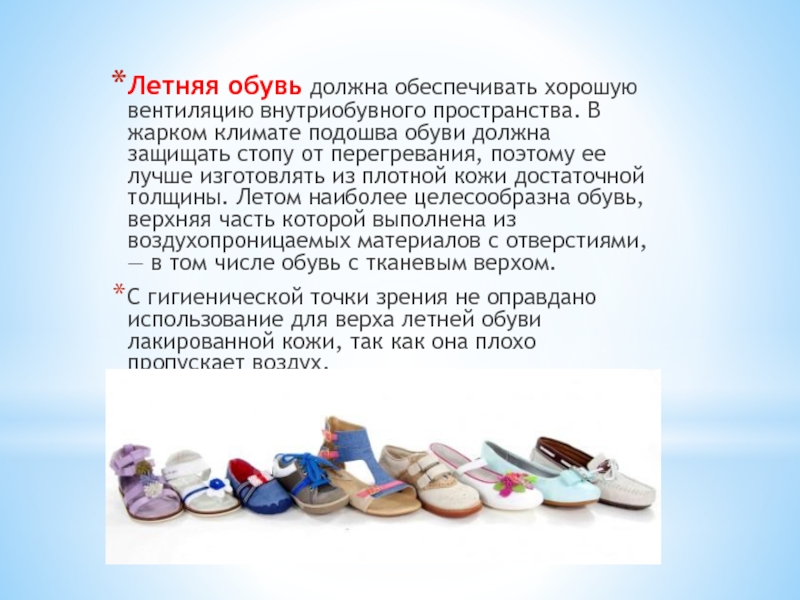 Слайд 17Летняя обувь должна обеспечивать хорошую вентиляцию внутриобувного пространства. В жарком климате