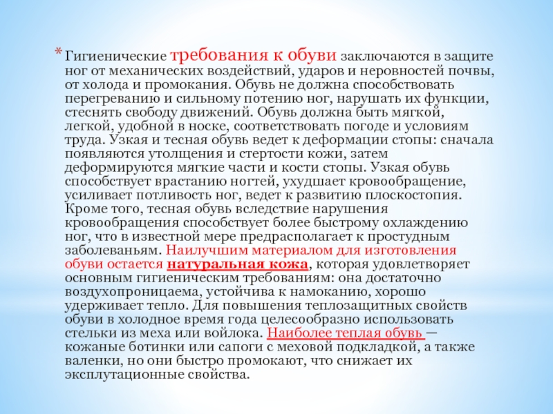 не должна способствовать перегреванию и сильному потению ног, нарушать их функции, стеснять свободу движений. Обувь должна быть мягкой, легкой, удобной в носке, соответствовать погоде и условиям труда. Узкая и тесная обувь ведет к деформации стопы: сначала появляются утолщения и стертости кожи, затем деформируются мягкие части и кости стопы. Узкая обувь способствует врастанию ногтей, ухудшает кровообращение, усиливает потливость ног, ведет к развитию плоскостопия. Кроме того, тесная обувь вследствие нарушения кровообращения способствует более быстрому охлаждению ног, что в известной мере предрасполагает к простудным заболеваньям. Наилучшим материалом для изготовления обуви остается натуральная кожа, которая удовлетворяет основным гигиеническим требованиям: она достаточно воздухопроницаема, устойчива к намоканию, хорошо удерживает тепло. Для повышения теплозащитных свойств обуви в холодное время года целесообразно использовать стельки из меха или войлока. Наиболее теплая обувь — кожаные ботинки или сапоги с меховой подкладкой, а также валенки, но они быстро промокают, что снижает их эксплутационные свойства.