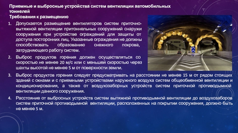 Расстояние от выбросных устройств систем вытяжной противодымной вентиляции до воздухозаборов систем приточной противодымной вентиляции, расположенных на покрытии сооружения, должно быть не менее 5 м.