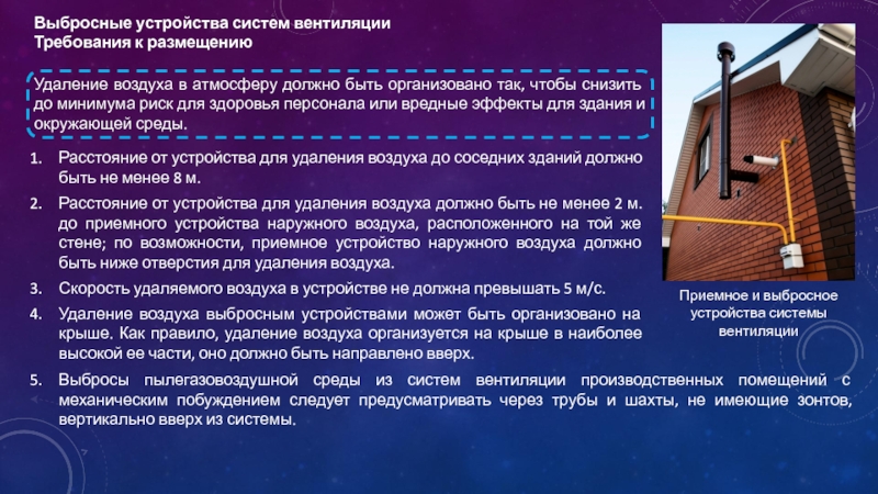 Удаление воздуха выбросным устройствами может быть организовано на крыше. Как правило, удаление воздуха организуется на крыше в наиболее высокой ее части, оно должно быть направлено вверх.