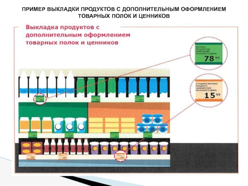 Слайд 11ПРИМЕР ВЫКЛАДКИ ПРОДУКТОВ С ДОПОЛНИТЕЛЬНЫМ ОФОРМЛЕНИЕМ ТОВАРНЫХ ПОЛОК И ЦЕННИКОВ