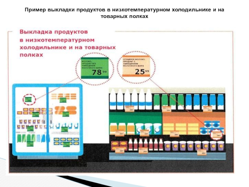 Слайд 13Пример выкладки продуктов в низкотемпературном холодильнике и на товарных полках