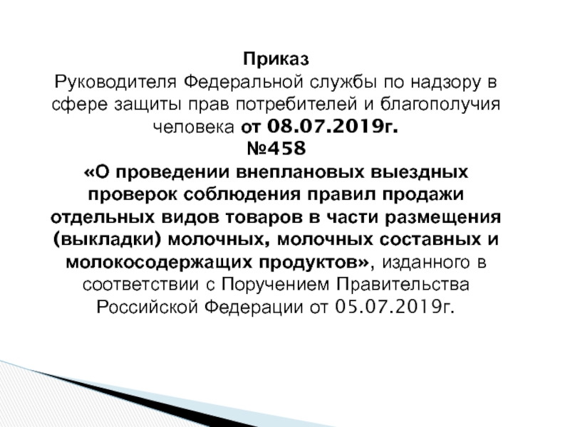 выездных проверок соблюдения правил продажи отдельных видов товаров в части размещения (выкладки) молочных, молочных составных и молокосодержащих продуктов», изданного в соответствии с Поручением Правительства Российской Федерации от 05.07.2019г.