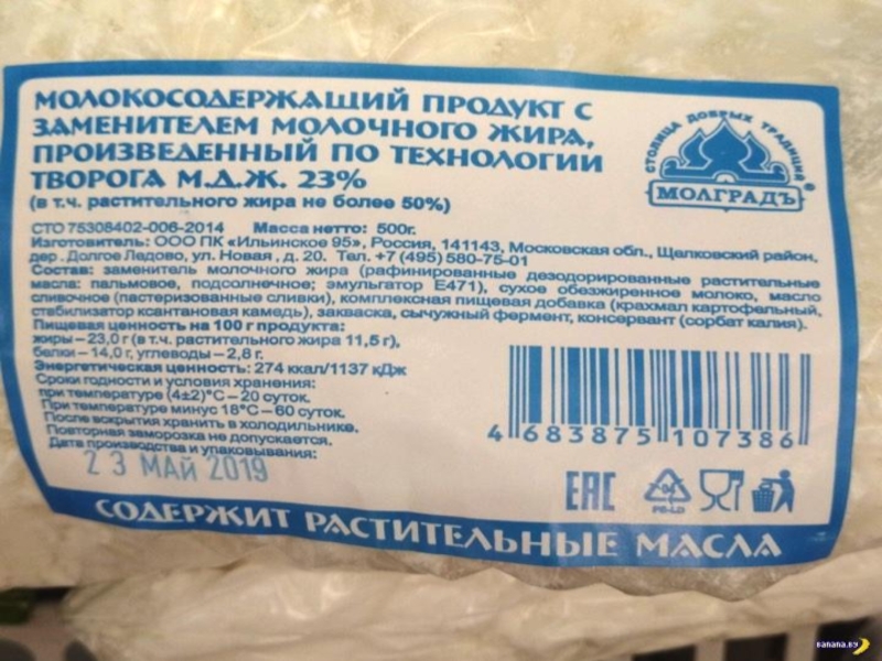 молокосодержащий продукт - продукт переработки молока, произведенный на основе молока, и (или) его составных частей, и (или) молочных продуктов, и (или) побочных продуктов переработки молока и немолочных компонентов (за исключением жиров немолочного происхождения, вводимых в состав как самостоятельный ингредиент и (или) немолочных белков, используемых для замены молочного белка), которые добавляются не в целях замены составных частей молока, с массовой долей сухих веществ молока в сухих веществах готового продукта не менее 20 процентов. Не допускается использование побочных продуктов переработки молока, полученных при производстве молокосодержащих продуктов с заменителем молочного жира.