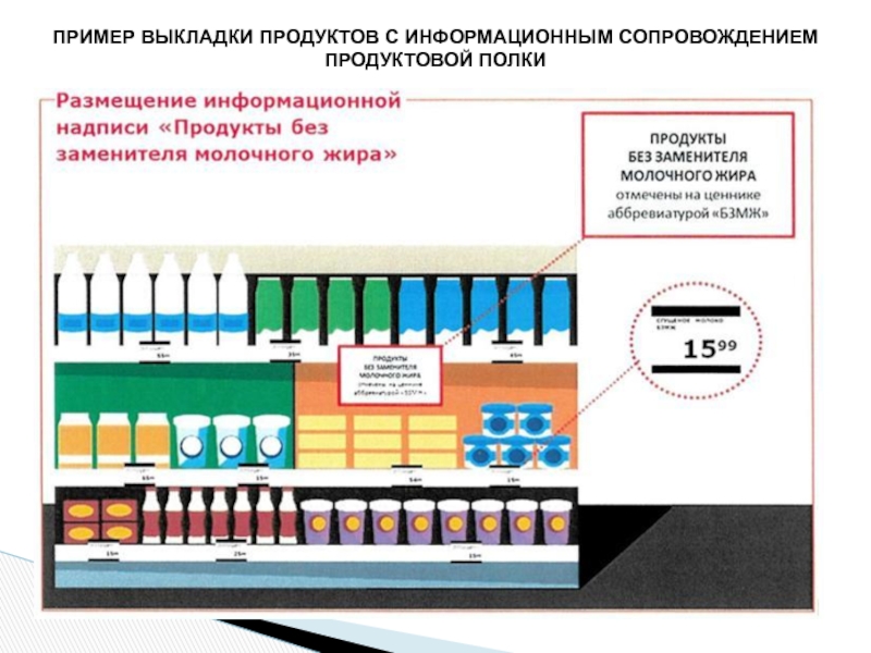 Слайд 16ПРИМЕР ВЫКЛАДКИ ПРОДУКТОВ С ИНФОРМАЦИОННЫМ СОПРОВОЖДЕНИЕМ ПРОДУКТОВОЙ ПОЛКИ