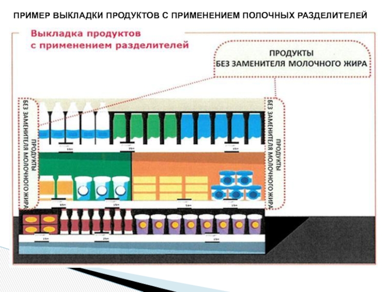 Слайд 9ПРИМЕР ВЫКЛАДКИ ПРОДУКТОВ С ПРИМЕНЕНИЕМ ПОЛОЧНЫХ РАЗДЕЛИТЕЛЕЙ