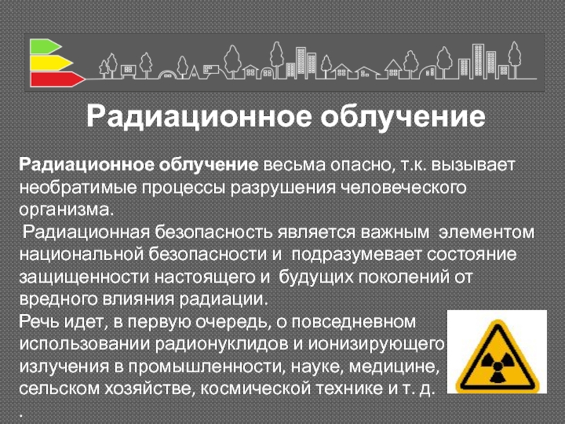 подразумевает состояние защищенности настоящего и будущих поколений от вредного влияния радиации.
