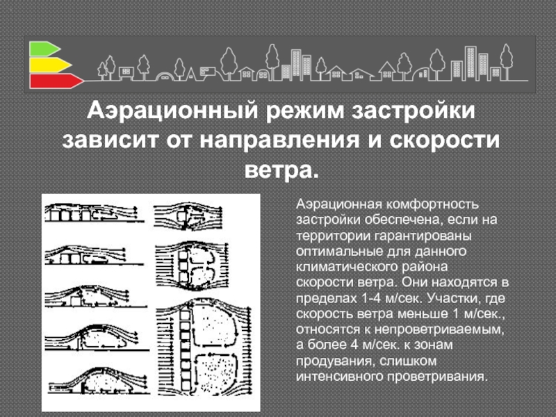 Слайд 8Аэрационный режим застройки зависит от направления и скорости ветра.