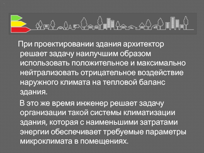 В это же время инженер решает задачу организации такой системы климатизации здания, которая с наименьшими затратами энергии обеспечивает требуемые параметры микроклимата в помещениях.