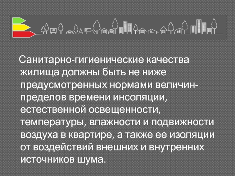 Слайд 24 Санитарно-гигиенические качества жилища должны быть не ниже предусмотренных