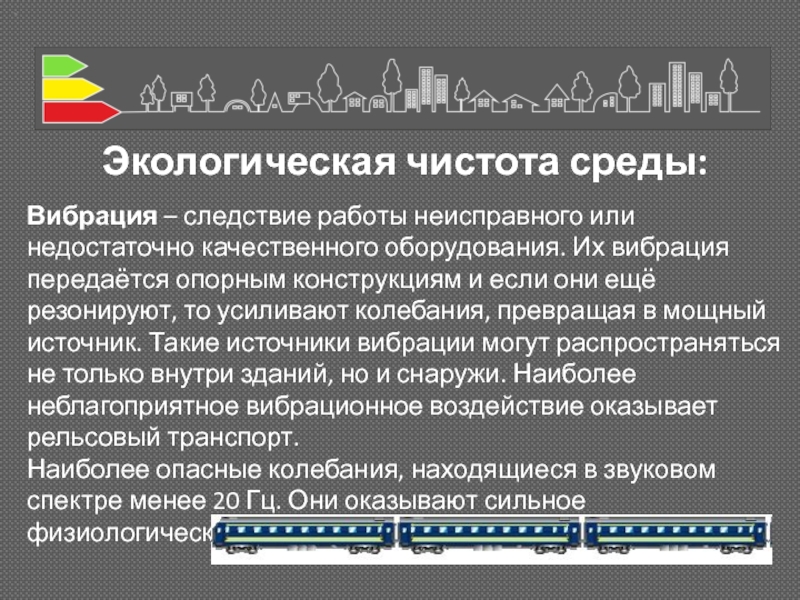 резонируют, то усиливают колебания, превращая в мощный источник. Такие источники вибрации могут распространяться не только внутри зданий, но и снаружи. Наиболее неблагоприятное вибрационное воздействие оказывает рельсовый транспорт.
