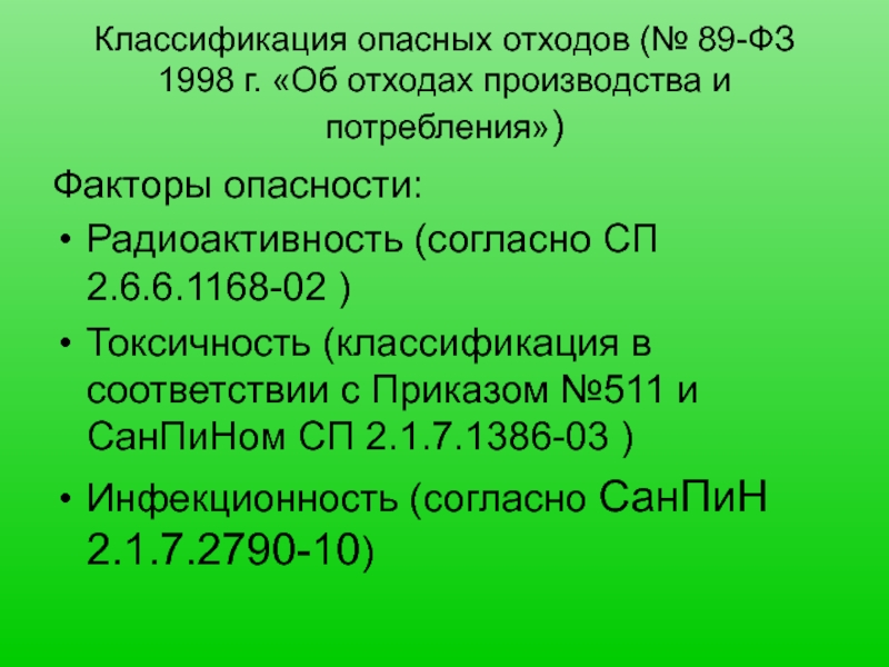 Слайд 10Классификация опасных отходов (№ 89-ФЗ 1998 г. «Об отходах производства