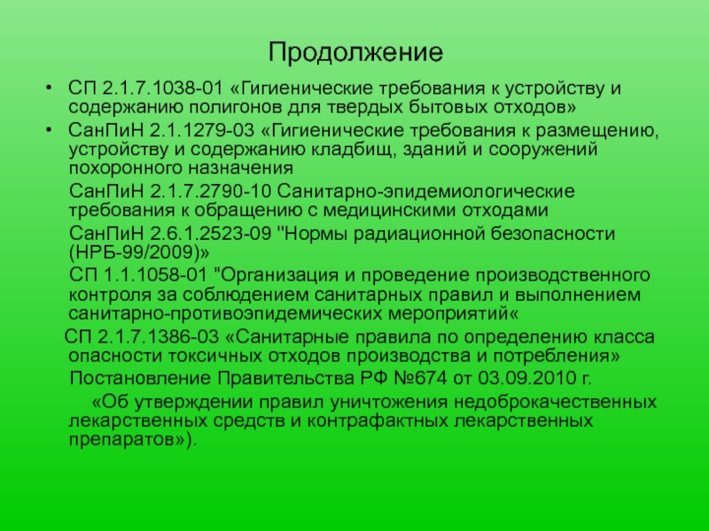 3. СанПиН 2.1.7.1322-03 «Гигиенические требования к размещению и обезвреживанию отходов производства и потребления»