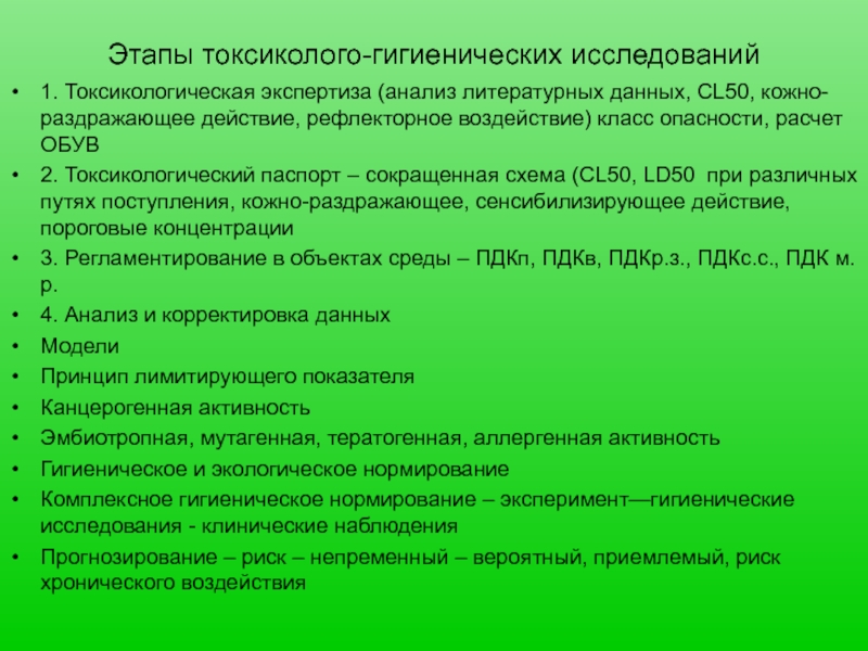 Слайд 3Этапы токсиколого-гигиенических исследований