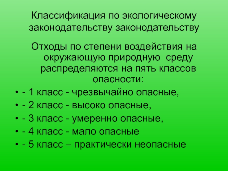 Слайд 14Классификация по экологическому законодательству законодательству
