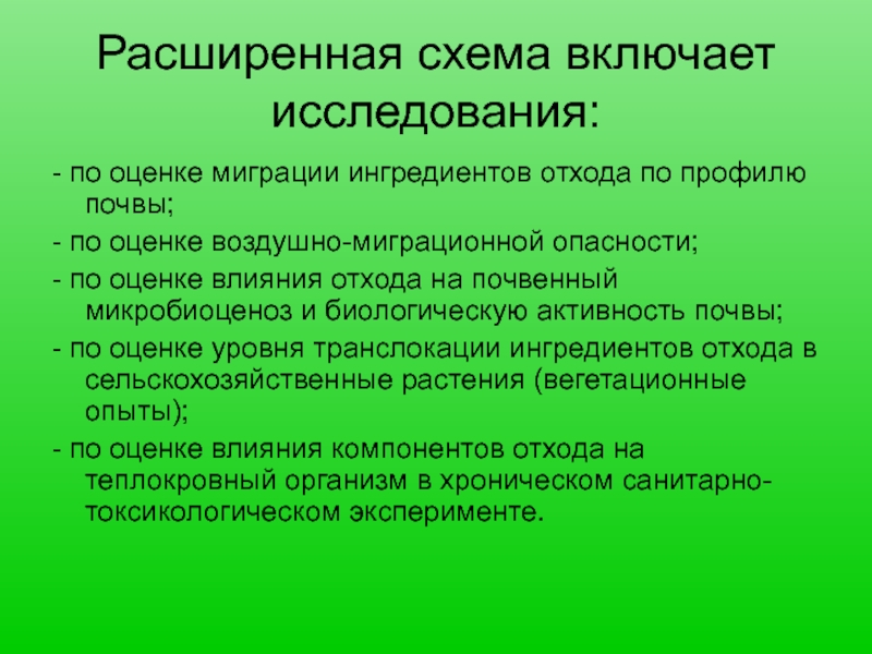 - по оценке уровня транслокации ингредиентов отхода в сельскохозяйственные растения (вегетационные опыты);