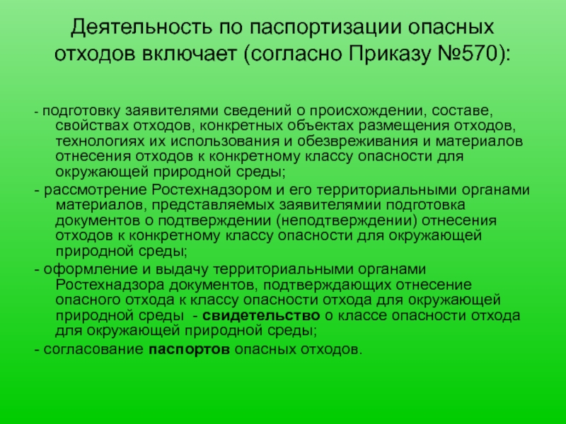 Слайд 18Деятельность по паспортизации опасных отходов включает (согласно Приказу №570):