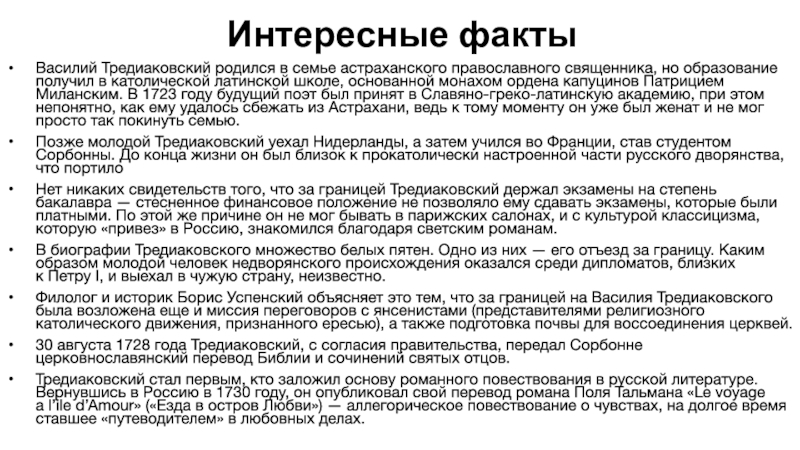 Интересные факты Василий Тредиаковский родился в семье астраханского православного священника, но образование получил в католической латинской школе, основанной монахом ордена