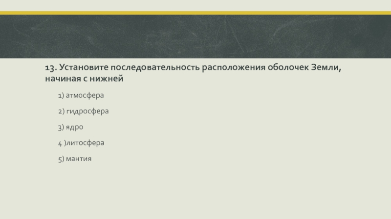 Слайд 2113. Установите последовательность расположения оболочек Земли, начиная с нижней