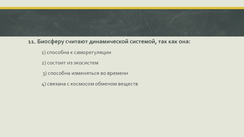 Слайд 1911. Биосферу считают динамической системой, так как она: