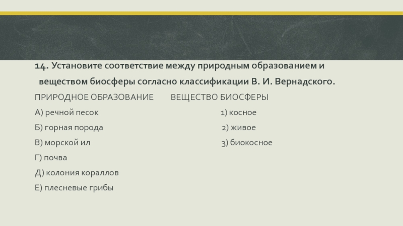 Слайд 2214. Установите соответствие между природным образованием и