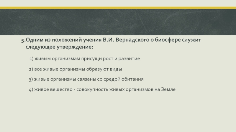 Слайд 135.Одним из положений учения В.И. Вернадского о биосфере служит следующее